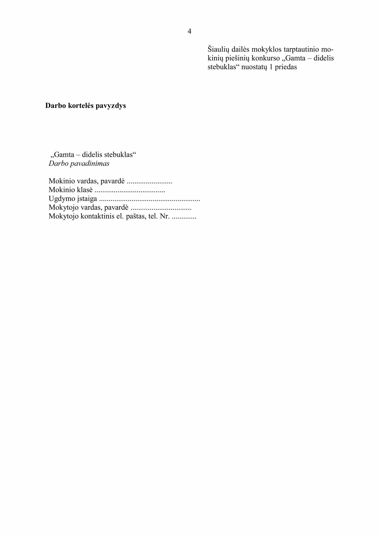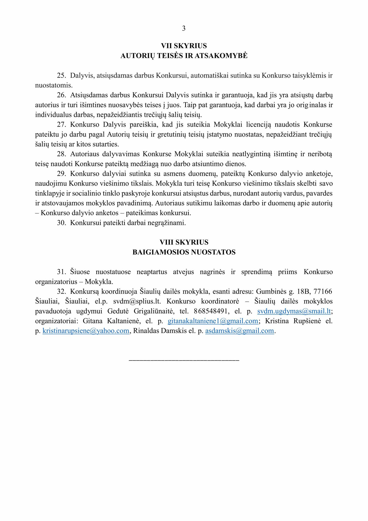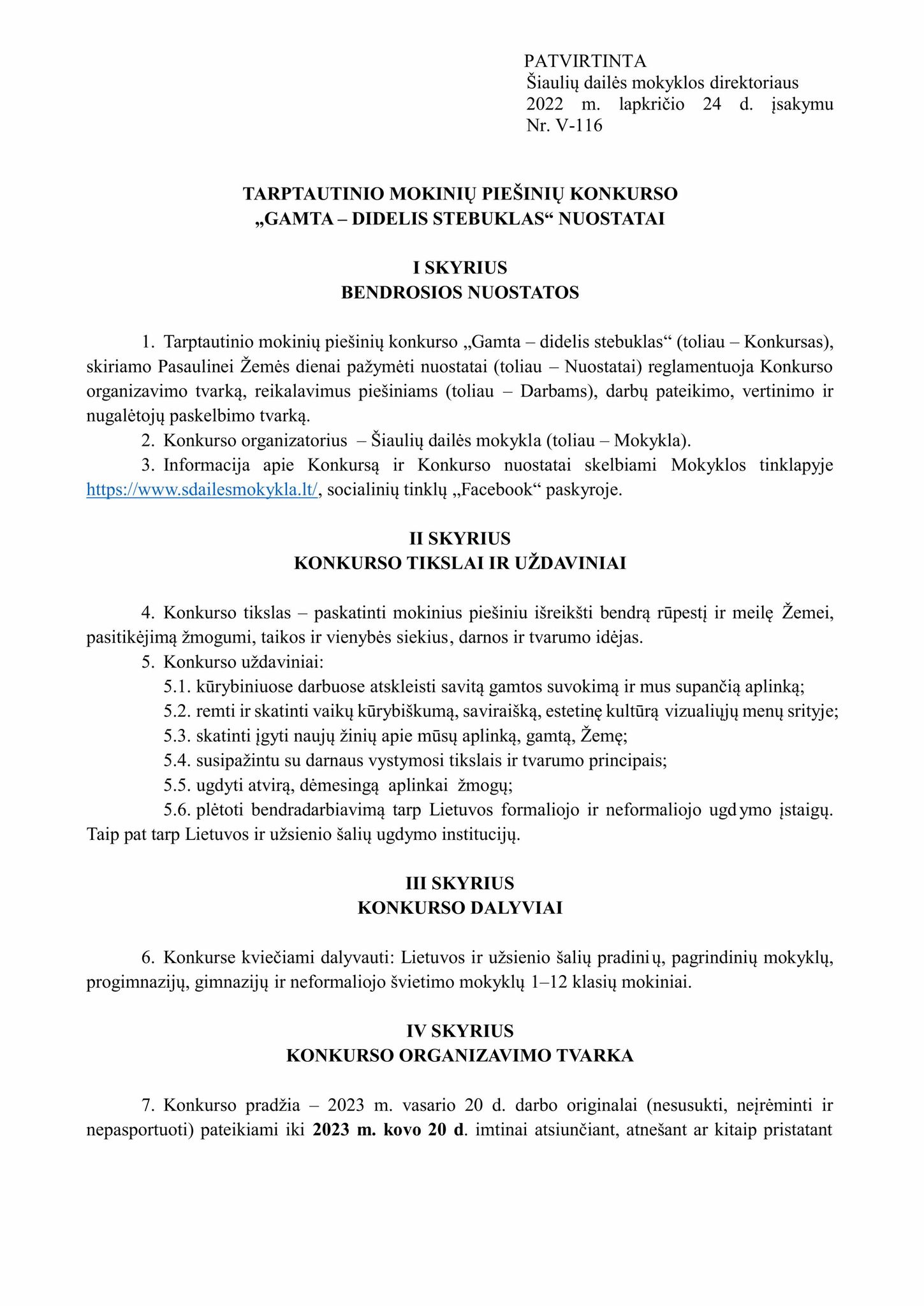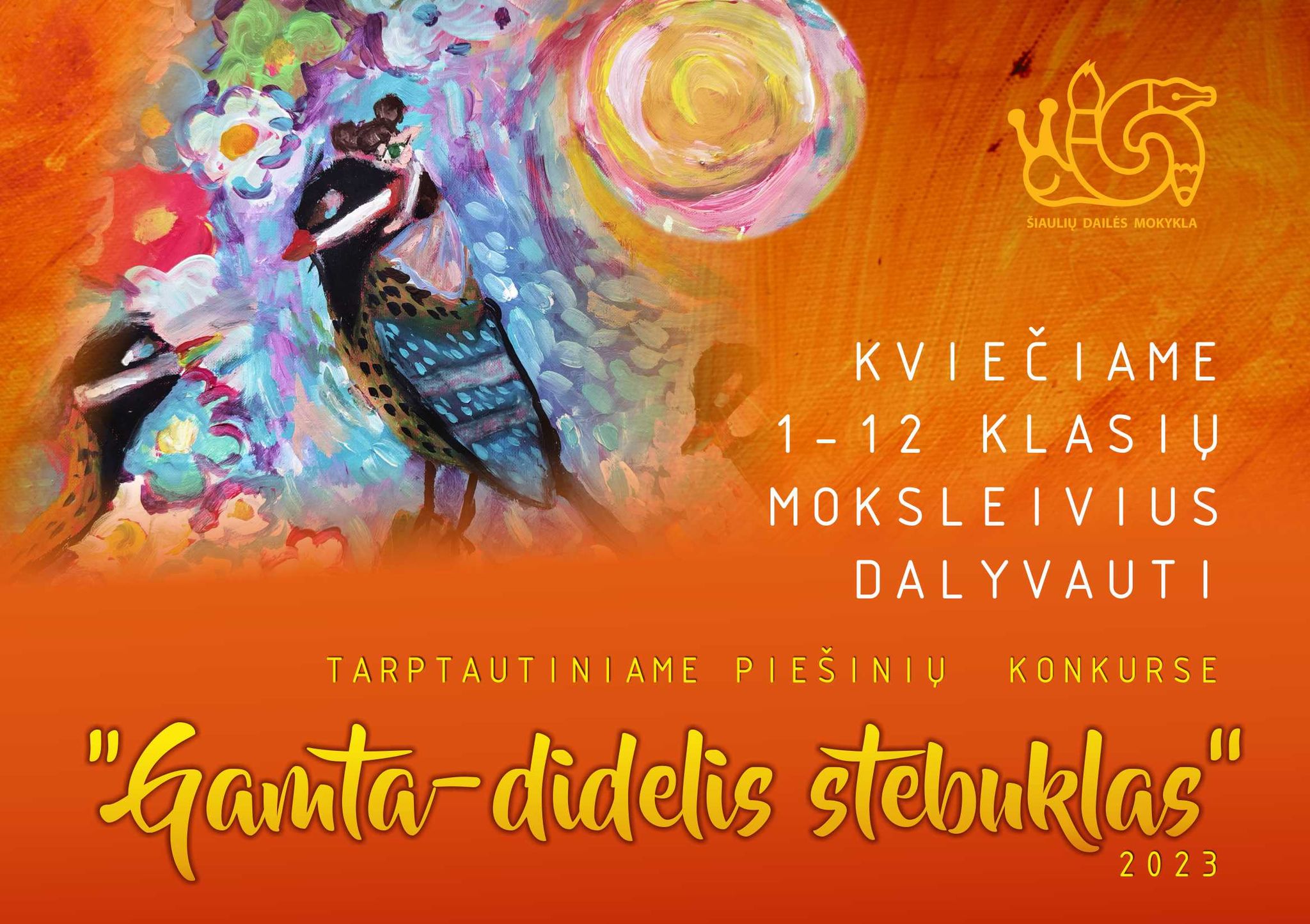 Kviečiame dalyvauti konkurse „Gamta-didelis stebuklas“ („Gamta yra didelis stebuklas“). Šio renginio dalyviai yra pradinių klasių, vidurinių klasių, vidurinių mokyklų mokiniai ir neformaliojo švietimo mokyklų mokiniai. Renginį organizuoja Šiaulių meno mokykla. Taisyklės prisegtos.